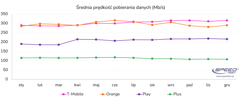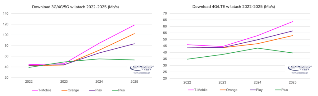 W 2025 roku doszło do zmiany lidera. Dotychczasowego zwycięzcę (Orange) z 2024 roku i przez część 2025 roku, zastąpił T-Mobile po raz pierwszy przekraczając barierę 300 Mb/s i notując wzrost o 38% r/r do 303,2 Mb/s. Tuż za nim uplasował się Orange z wynikiem 295,6 Mb/s (+ 23%). Różnica między dwoma liderami jest minimalna, co zapewne zapowiada zaciętą rywalizację w nadchodzących miesiącach.