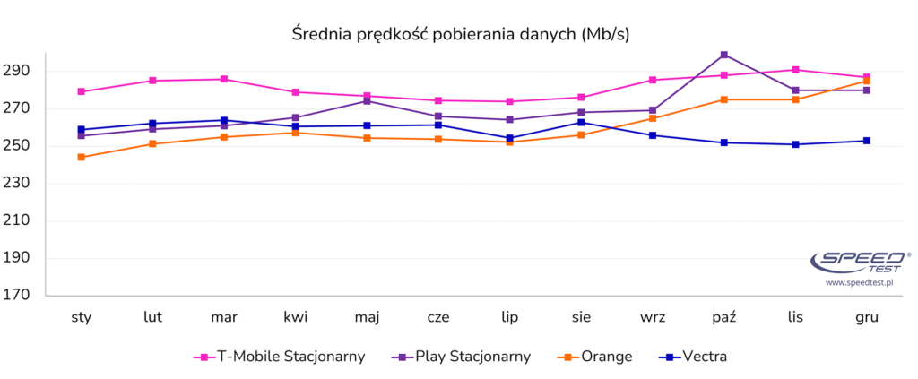 Czwarty rok z rzędu dostawcą najszybszego internetu domowego został T-Mobile Stacjonarny z downloadem na poziomie 282,3 Mb/s. Operator ten zanotował stabilny wzrost szybkości o 8% względem roku ubiegłego. Drugie miejsce zajął Play (270,9 Mb/s, wzrost o 10%), awansując z trzeciego miejsca w 2024 roku. Po raz pierwszy w tej kategorii na podium „wskoczył” Orange (260,7 Mb/s, +15%). Już drugi rok z rzędu najbardziej przyspieszyła Netia (+19%, do 236,7 Mb/s), a udany debiut w rankingu zaliczył „krewniak” z Grupy Cyfrowy Polsat – Plus z wynikiem 254 Mb/s, który zajął piąte miejsce za cały rok i czwarte w grudniu. Ciekawie zapowiada się 2026 rok, gdyż w grudniu doszło do kolejnego przetasowania i Orange został wiceliderem (285 Mb/s), minimalnie za T-Mobile (287 Mb/s) i minimalnie przed Play (280 Mb/s).