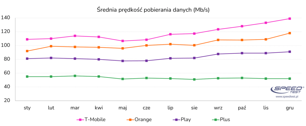 W kategorii prędkości pobierania liderem zestawienia po raz kolejny został T-Mobile, osiągając 118,4 Mb/s. Jest to wzrost o 40% w stosunku do roku ubiegłego. Jeszcze większy przyrost – bo o 44% – odnotował Orange przyspieszając do 102,4 Mb/s. Na trzecim miejscu uplasował się Play z solidnym wynikiem 83,4 Mb/s (+26% r/r). Jedynym operatorem z „wielkiej czwórki”, który odnotował niewielki spadek jest Plus, którego średnia prędkość spadła o 3%, do poziomu 53,1 Mb/s.