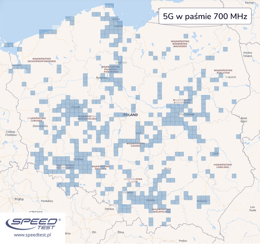 Obszary z odnotowanym zasięgiem 5G w paśmie 700 MHz widoczne są poniżej: