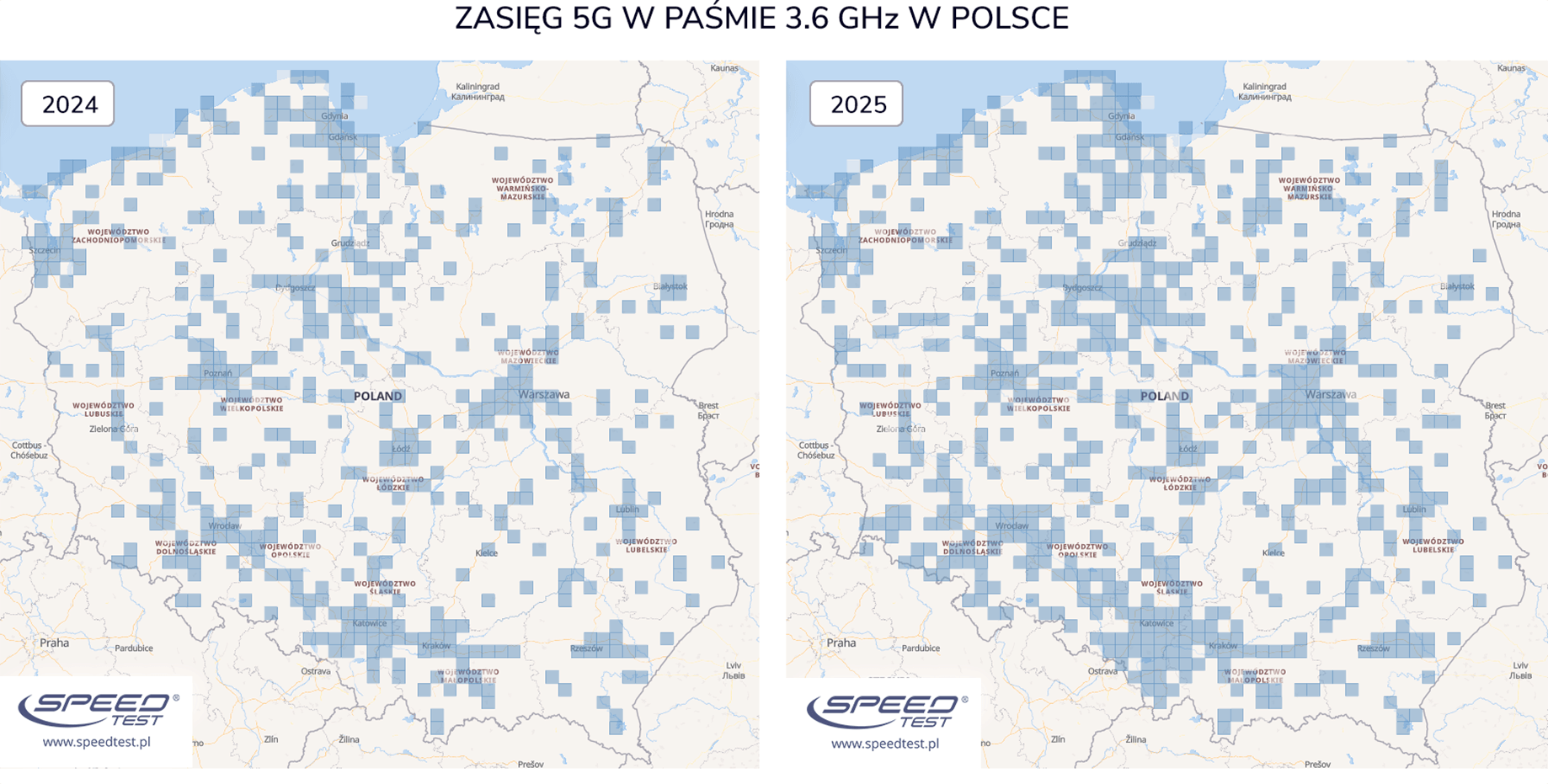 Rozwój zasięgu 3,6 GHz dla wszystkich operatorów w 2024 i 2025 roku przestawiają poniższe mapy: