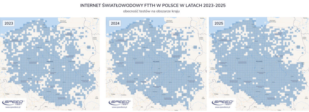 Zasięg światłowodu FTTH w latach 2023-2025 według SpeedTest.pl przedstawia poniższy rysunek: