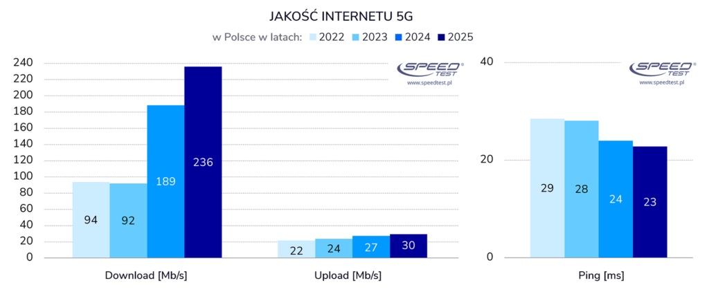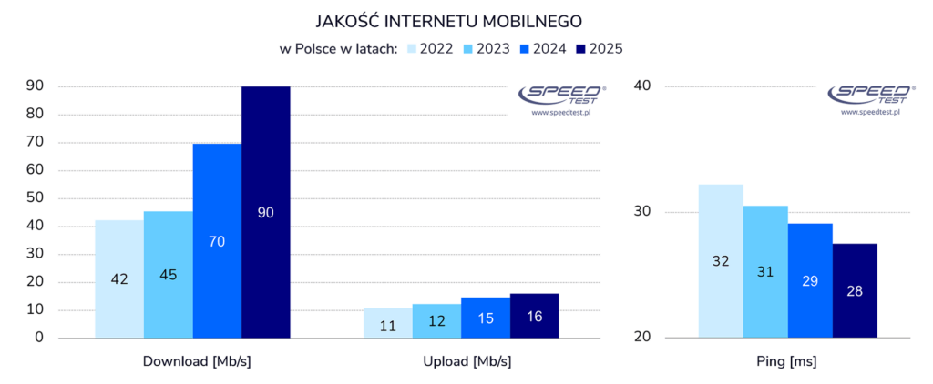Przyspieszenie 5G „ciągnie” w górę całą kategorię mobilnego internetu (3G/4G/5G). To kolejny rok z dużym przyrostem prędkości – w stosunku do 2024 roku o 30% do 90 Mb/s. Symbolicznie zmieniła się prędkość wysyłania (+1 Mb/s, do blisko 16 Mb/s) i poprawiły się pingi (-1 ms, do 28 ms).