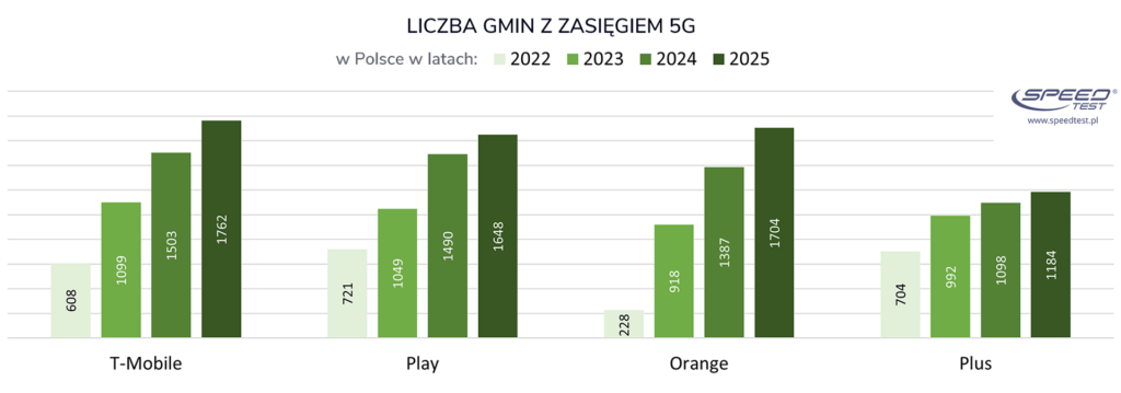 Operatorzy wciąż intensywnie inwestowali w rollout 5G. Największa liczbę gmin z testami 5G na koniec 2025 roku odnotowaliśmy w T-Mobile (1762 gminy na 2479 w całym kraju) z niewielką przewagą nad Orange (1704) i Play (1648). Mniejsze pokrycie zapewniał Plus, którego testy 5G wystąpiły w 1184 gminach. Orange, podobnie jak w poprzednim roku, udostępnił zasięg 5G w największej liczbie gmin (+318), przed T-Mobile (+259) i Play (+158). Testy 5G Plusa pojawiły się po raz pierwszy w 86 nowych gminach. Plus w dalszym ciągu skupia się na rozwoju pasma 2,6 GHz – nie odnotowaliśmy bowiem postępów w zwiększaniu zasięgu 3,6 GHz.