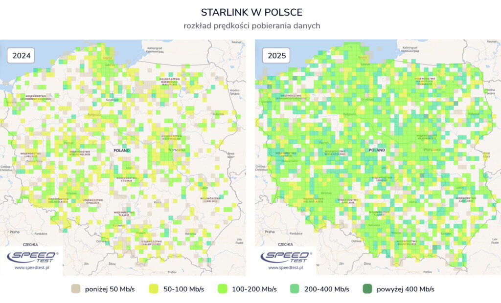Wybraliśmy ten temat jako przykład, że nawet na mocno konkurencyjnym rynku usług dostępu do internetu można zaistnieć z produktem, który zdobędzie sporą popularność. Tak stało się w przypadku Starlinka. Do połowy 2025 roku operator ten ze względu na wysokie ceny był dostawcą niszowym. Redukcja cen, zmiana modelu ofertowego oraz zwiększenie przepustowości technologii satelitarnego dostępu do internetu spowodowały skokowy wzrost zainteresowania tą usługą. Wolumen testów w sieci Starlinka w 2025 roku był prawie czterokrotnie wyższy niż rok wcześniej, a w grudniu 2025 roku stanowił już 1% wszystkich testów w rankingu domowym i był na poziomie zbliżonym dla operatora tej wielkości co TOYA. Wzrost zainteresowania przyszedł wraz z mocną poprawą jakości – prędkość wzrosła z 93 Mb/s w 2024 do 159 Mb/s za cały 2025 rok, a w grudniu sięgnęła już 184 Mb/s. Upload natomiast jest na znacznie niższym poziomie (33 Mb/s w grudniu) niż u większości popularnych dostawców kablowych, ale nie odbiega od konkurencji mobilnej. Ping jest również bardzo solidny (30 ms za cały rok i 25 ms za grudzień). Rozkład testów – okolice dużych miast oraz popularne obszary turystyczne – wyraźnie wskazuje na potrzebę posiadania stabilnego internetu na „działkach” i w „pensjonatach”.
